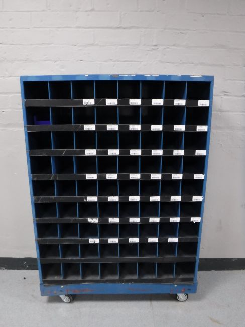 An industrial metal pigeon hole trolley