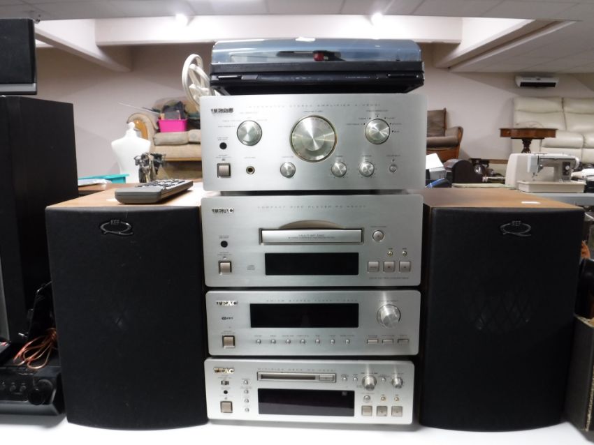A three piece Teac HiFi separates system together with a Kenwood turntable and a pair of KEF speakers