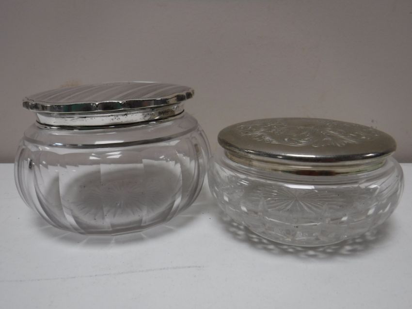 A silver lidded glass dressing table pot, together with another with plated lid