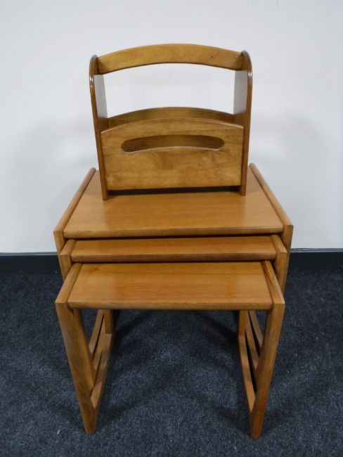 A nest of three teak tables, together with a teak tile top coffee table, a teak magazine rack and a standard lamp