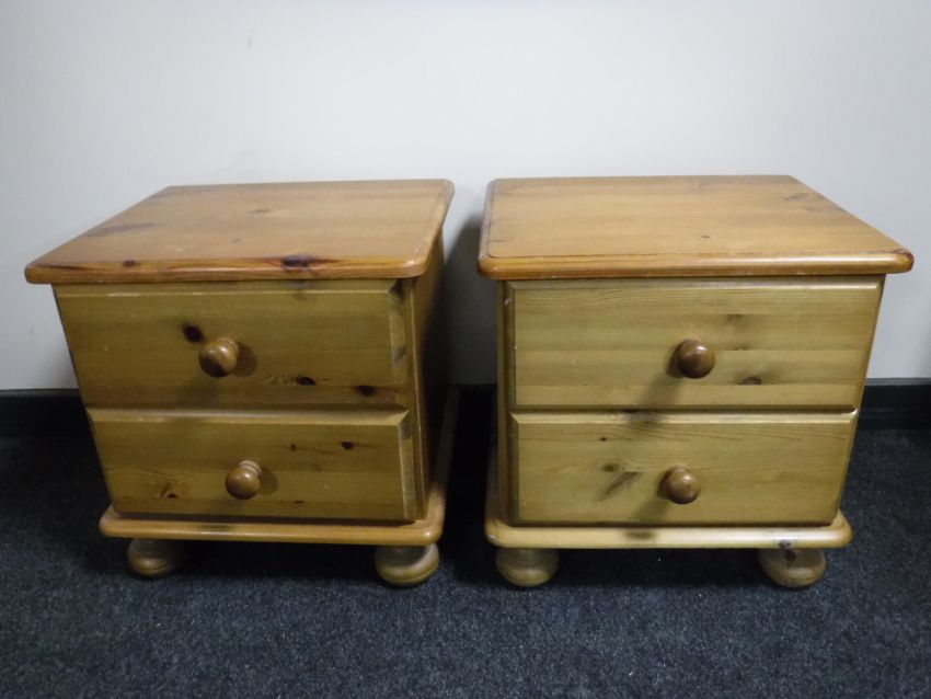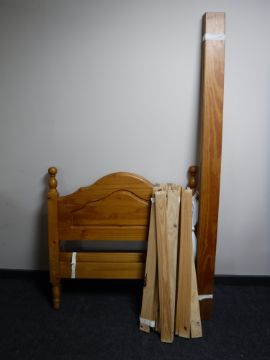 A pine 4' 6" bed frame, together with a 3' bed frame and a pair of two drawer bedside stands