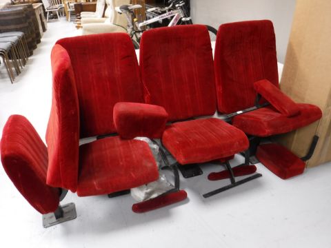 Four mid 20th century cinema seats upholstered in a red fabric