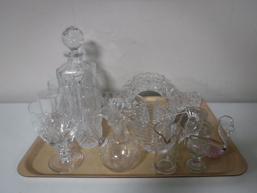 A tray containing a lead crystal whisky decanter together with a quantity of lead crystal drinking glasses, bowls, swan ornaments, vintage drinks measure etc