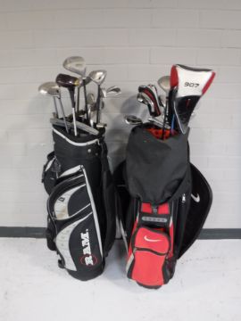A Nike golf bag, containing a half set of Nike irons, together with assorted drivers and a Ram golf bag, containing a half set of Maxfly irons, assorted drivers including Callaway and four putters (various)