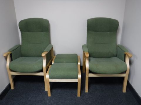 A pair of beech framed Nordic easy chairs with stools, upholstered in a green fabric