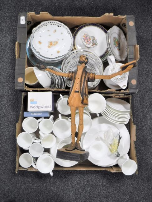 A wooden figure of Don Quixote, together with two boxes of assorted dinner ware, boxed Wedgwood jasperware, Karl Ens bird ornament, wall plates etc