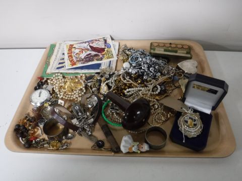 A tray containing costume jewellery, rugby medal, sterling silver napkin ring, theater programmes, pocket watch, etc