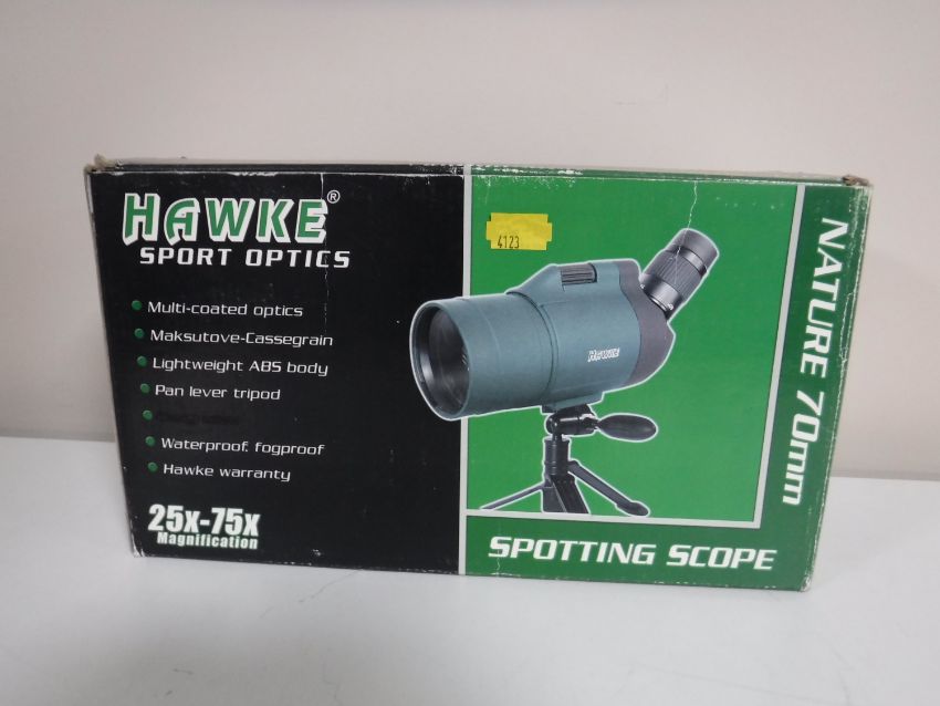 A boxed Hawke Sports Optics 25X75 magnification spotting scope and stand
