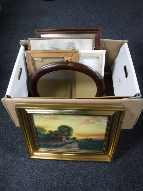 A box containing continental school pictures and prints including religious study, gilt framed oil on canvas, rural scene at sunset, oval mahogany framed mirror, Carlsberg advertising mirror, etc