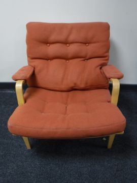 A beech framed armchair, upholstered in a button fabric
