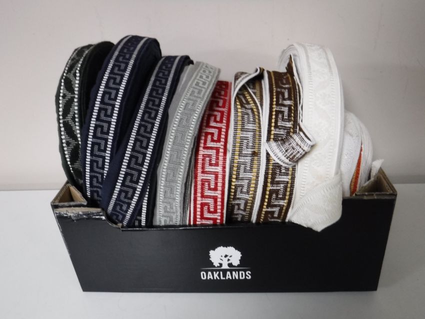A box containing nine spools of vintage Silver Cross pram trim