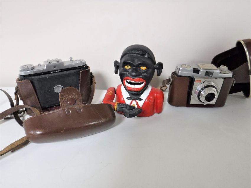 A cast metal money box together with two cameras in leather cases