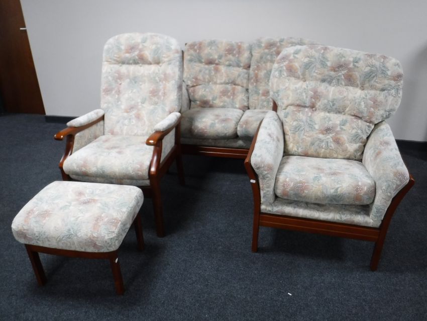 A four piece contemporary lounge suite comprising of two armchairs with a stool and a two seater settee