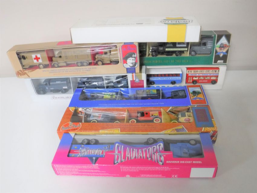 Eight boxed diecast vehicle packs including Royal Air Force, 1930's Express Parcel Collection, Pan Am etc