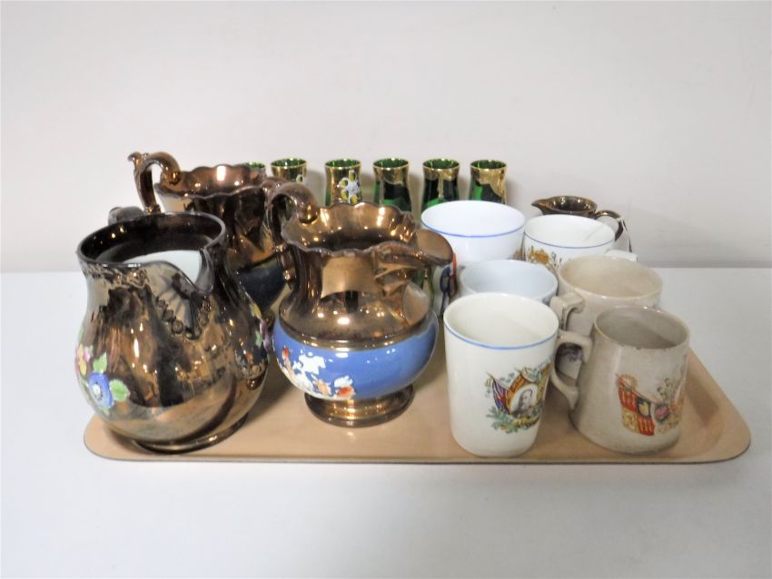 A tray containing late 19th and early 20th century commemorative mugs, four copper lustre jugs, Victorian green glass sugar basin and jug together with a set of six liqueur glasses