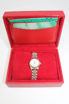 A Lady's stainless steel and 18ct gold Rolex Oyster Perpetual Datejust Wriswatch, on Rolex steel and gold Jubilee bracelet with deployant clasp, in Rolex box with Rolex booklet and guarantee card, Chronometer certification etc