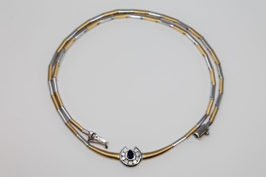 An 18ct white and yellow gold diamond and sapphire set necklace, a pear-cut sapphire within a horseshoe setting, surrounded by nine brilliant cut diamonds, 26.5g (ensuite to the previous lot)