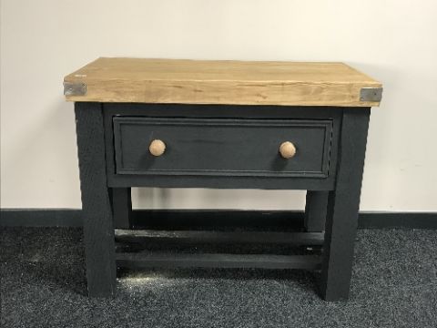 A reclaimed pine butchers block fitted a drawer on a painted base