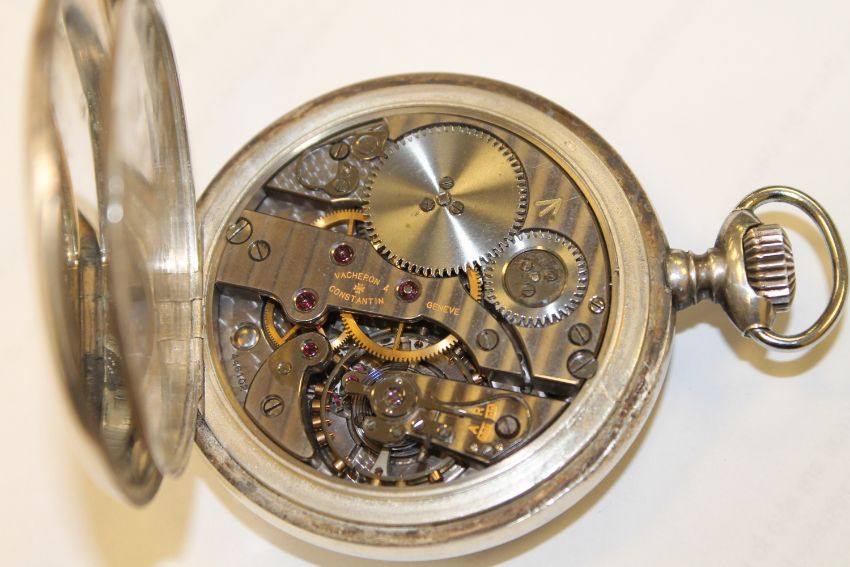 Crown loose and in need of attention. The crown adjusts the watch but will not wind it. Case 60mm. Silvered dial slightly tarnished. Watch not running. Case in good condition. Movement numbered 446102.