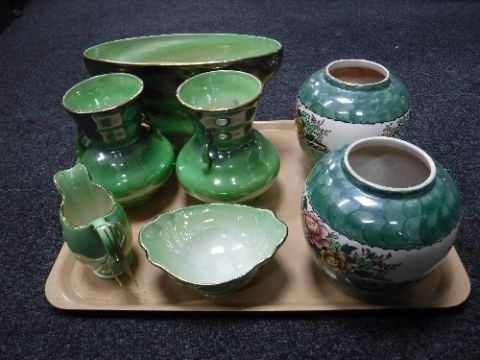 A tray of five pieces of Maling green lustre china and a pair of Maling peony rose ginger jars (no lids)