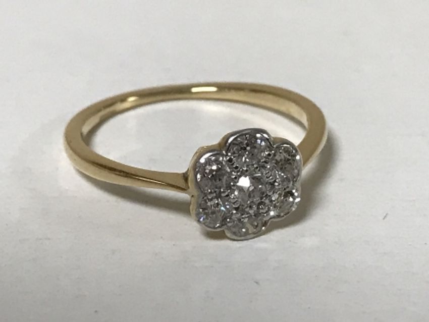 The ring is in good condition. It is set with 7 old cut diamonds in an illusion setting. The ring is size M and weighs 1.9g. The hallmarks are worn but it tests as 18ct gold. Total diamond weight estimated at 0.15 carat.