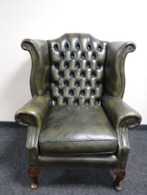 A green button leather Chesterfield chair