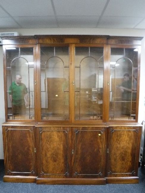 A good quality mahogany four door break front display cabinet, fitted cupboards beneath