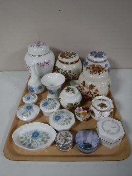 A tray containing assorted ginger jars with lids, Wedgwood clementine pill boxes, vases, dish candle holder, an Old Country Roses preserve pot, etc