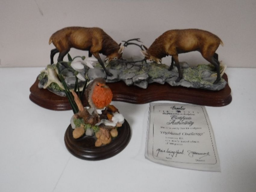 A Border Fine Arts figure - Highland Challenge, limited edition number 424/500, on plinth, with certificate, together with a Country Artist figure - Malvern Robin Snowdrops. (2) CONDITION REPORT: Highland Challenge overall in good condition but with a very small chip to the tip of the tree branch on the left hand side. This is not very visible and could be improved very easily. Robin figure in good condition.