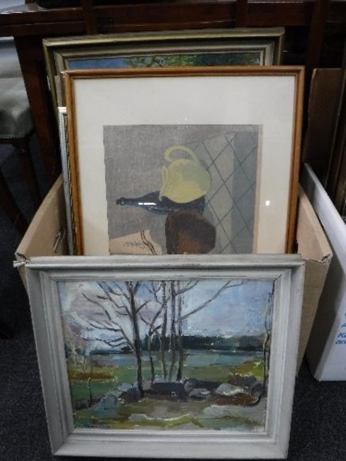 A box of continental school oils and prints - abstract, figures in garden dated Gorm dated '52, black & white photographs etc