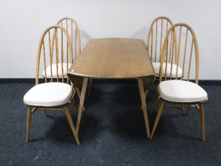 An Ercol elm drop leaf table, together with four high backed chairs