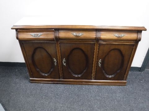 A narrow triple door and marble topped sideboard