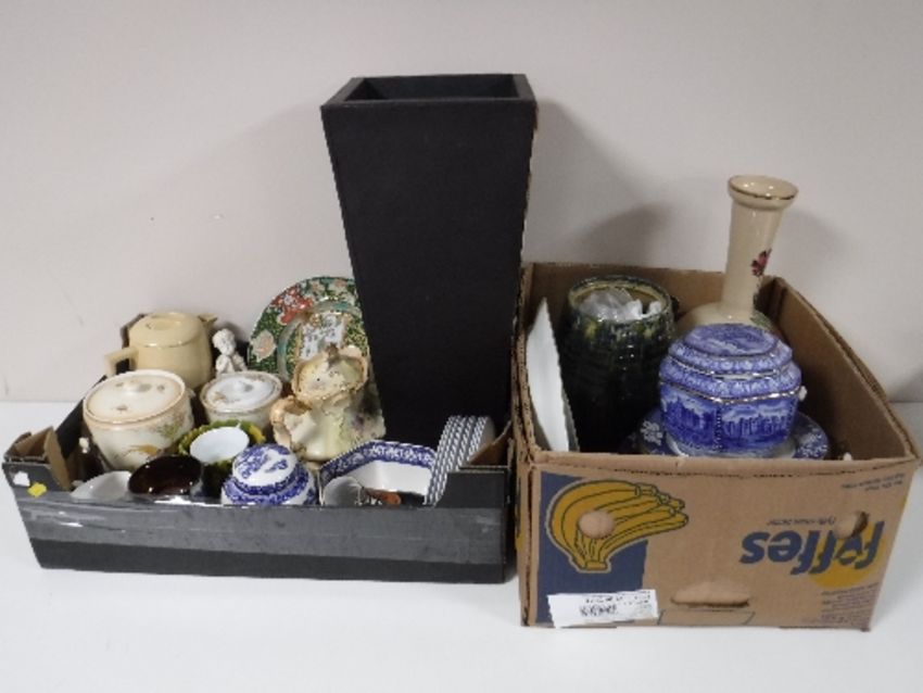 Two boxes containing blue and white dinnerware, Ringtons caddie, hand painted glass vase, Crown Ducal biscuit barrel, etc