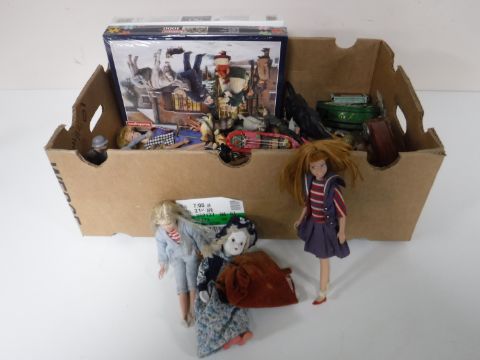 A box containing mid twentieth century toys including oversized plastic soldiers, dolls, plastic animal figures, Britains Indians, together with a box containing Wills cigarette cards, etc