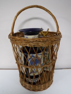 A box containing assorted lead crystal glassware, nineteenth century meat plates, bookends, large wicker basket, blue and white glazed pottery vase
