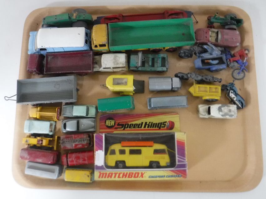 A tray containing mid twentieth century die cast vehicles, including a Dinky Leyland Octopus, Dinky Ford Transit van, Lesney miniature die cast vehicles, etc