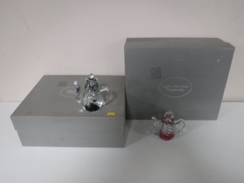 Two boxes containing three glass teapot and three glass coffee pot paperweights