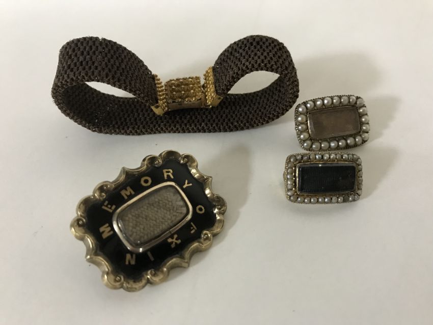 A group of early 19th century memoriam jewellery including a hair bracelet with high carat gold clasp