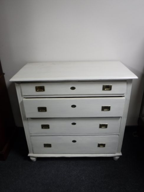 An early twentieth century painted pine four drawer chest with brass drop handles