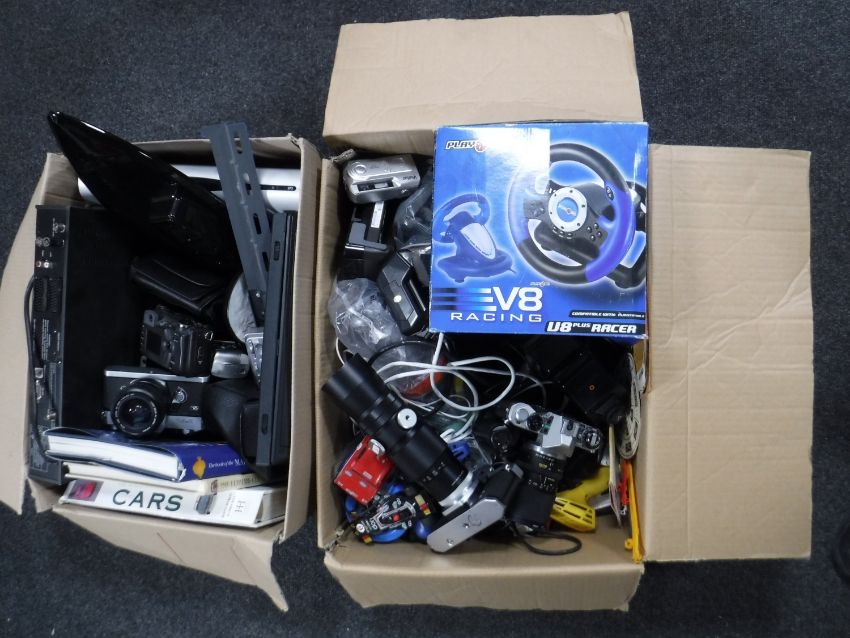 Two boxes containing assorted cameras and lenses, IBM laptop, Scalextric cars, books relating to motor cars and fishing