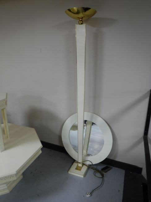 An octagonal white coffee table and a nest of two tables, together with a white and brass uplighter and a circular white framed mirror
