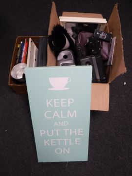 Two boxes containing video camera, photography books, an overhead projector, coin sorter picture frames, rug, etc