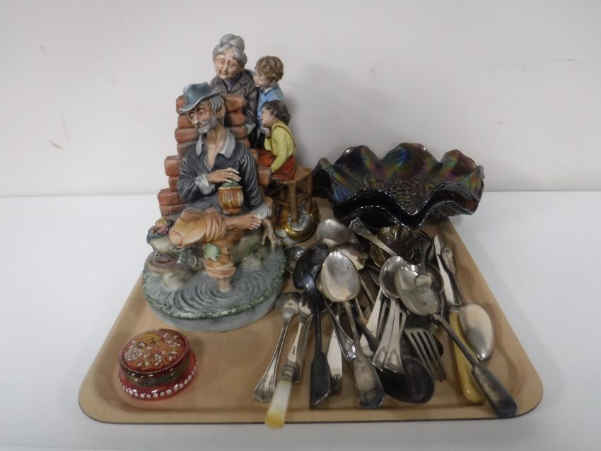A tray containing two petrol glass dishes, a Victorian cranberry glass, hand painted box, assorted table cutlery, two continental figurines, etc