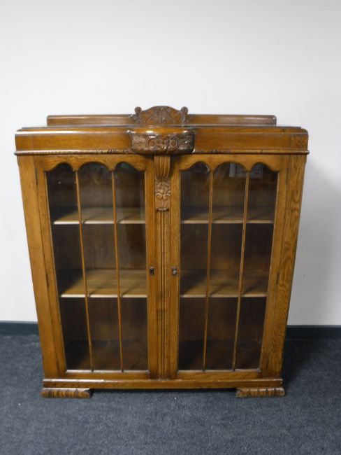 A carved oak glazed door double door bookcase
