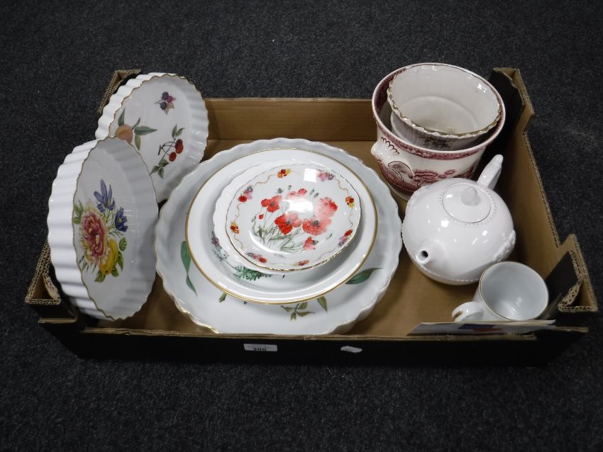 A box of Royal Worcester flan dishes, Spode stafford flowers gilded dish, Royal Legion plate, teapot, planters etc together with a tray of German china tea service, Royal Worcester silvered teapot, thimble stand and thimbles