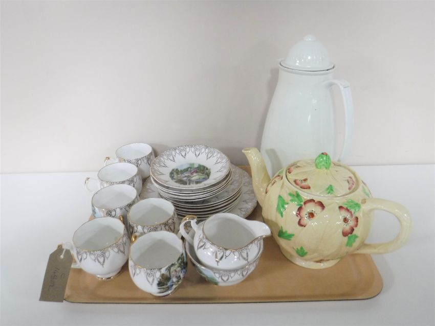 An Anne china tea service with gilded decoration, a coffee pot and a pottery teapot