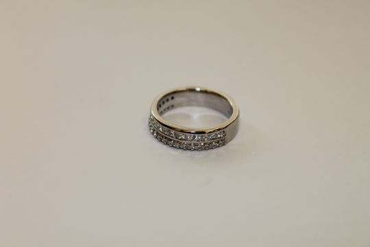 An 18ct white gold diamond half eternity ring, set with a row of 17 princess cut diamonds and a row of 21 brilliant cut diamonds in a claw setting, size J. Accompanied by a jeweler's insurance valuation for the sum of £2,000, which states the total diamond weight to be approximately 0.75 carat, the stones being of G-H colour and SI1/SI2 clarity.
