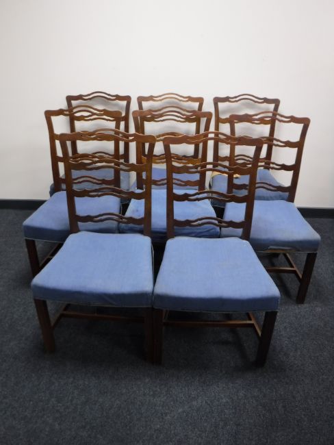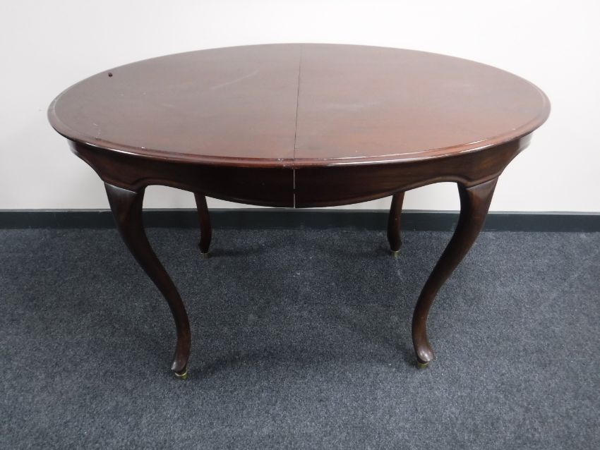 An oval mahogany extending dining table on cabriole legs, with two leaves, together with a set of eight mahogany ladder back dining chairs