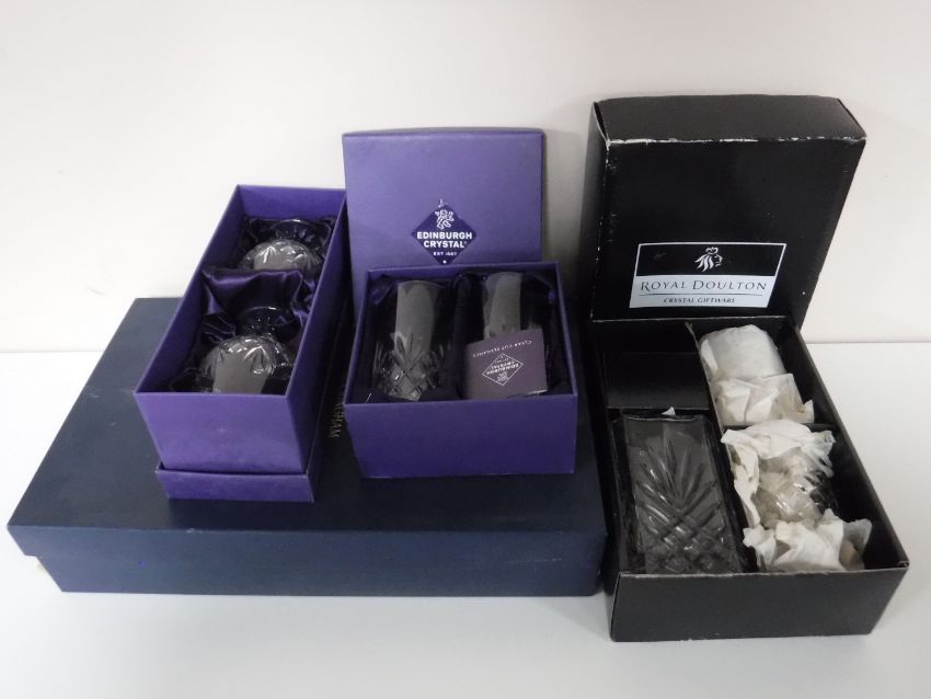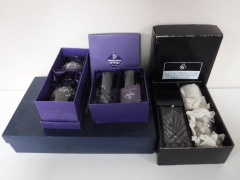 A box of six Rockington Crystal wine glasses (one damaged), a boxed Royal Doulton decanter and glass set, boxed pair of Edinburgh Crystal brandy glasses and a boxed pair of Edinburgh Crystal tumblers