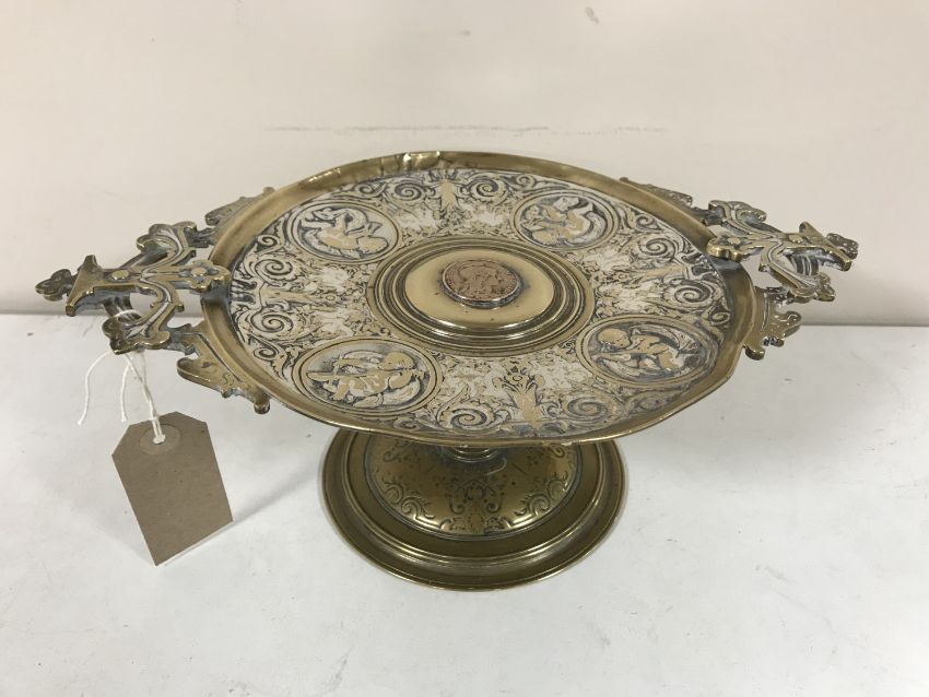 A late nineteenth century silvered brass comport stand with central coin , width 32 cm.